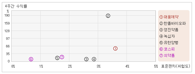| 업종평균에 비해서 변동폭 대비 수익률은 긍정적 12일 오전 10시5분 현재 전일대비 15.92% 오른 207,500원으로 강세를 보이고 있는 대웅제약은 지난 1개월간 52.57% 상승했다. 같은 기간동안 변동성의 크기를 말해주는 표준편차는 3.6%를 기록했다. 이는 코스피 업종내에서 주요종목들과 비교해볼 때 대웅제약의 월간 주가수익률이 상당히 높았던 만큼 변동성도 상대적으로 매우 높은 수준을 유지했다는 뜻이다. 최근 1개월을 기준으로 대웅제약의 위험을 고려한 수익률은 14.6을 기록했는데, 변동성은 컸으나 주가상승률이 괜찮았기 때문에 위험대비 수익률도 높은 수준을 나타냈다. 또한 코스피업종의 위험대비수익률 1.1보다도 높았기 때문에 업종대비 성과도 긍정적이라고 할 수 있다. 다음으로 업종과 시장을 비교해보면 대웅제약이 속해 있는 코스피업종은 의약품지수보다 변동성과 수익률이 모두 낮은 모습을 보여주고 있다. 다시 말해서 동업종의 탄력이 떨어지면서 업종상승률도 미진했다는 의미이다. |
