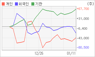 | 외국인과 개인은 순매도, 기관은 순매수(한달누적) 기관이 3일연속 순매수를 보이고 있는 반면에 외국인은 2일연속 순매도를 보이고 있다. 4주간을 기준으로 보면 기관이 초반에 동종목을 순매수한 이후에 최근에는 순매수량이 줄어들고 있음에도 불구하고 66,477주를 순매수한 반면, 외국인은 순매도로 돌아서면서 23,878주를 순매도했고, 개인들도 초반에 동종목을 순매도한 이후에 근래에는 순매도량을 줄이면서 42,599주를 순매도했다. |