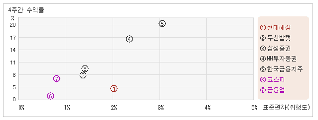 12일 오후 1시35분 현재 전일대비 3.1% 오른 46,600원을 기록하고 있는 현대해상은 지난 1개월간 2.87% 상승했다. 같은 기간동안 변동성의 크기를 말해주는 표준편차는 2%를 기록했다. 이는 금융업 업종내에서 주요종목들과 비교해볼 때 현대해상의 월간 변동성이 상대적으로 작은 편은 아니었으나 주가상승률은 주요종목군 내에서 가장 낮은 수준을 유지했다는 의미다. 최근 1개월을 기준으로 현대해상의 위험을 고려한 수익률은 1.4를 기록했는데, 변동성이 중간 수준을 유지했지만 주가상승률이 낮았기 때문에 위험대비 수익률은 가장 저조했다. 게다가 금융업업종의 위험대비수익률 6.8보다도 낮기 때문에 업종대비 성과도 좋지 않았다고 할 수 있다. 다음으로 업종과 시장을 비교해보면 현대해상이 속해 있는 금융업업종은 코스피지수보다 변동성과 수익률이 모두 높은 모습이다. 다시 말하면 동업종에 탄력이 붙으면서 지수대비 초과상승했다는 의미이다.