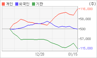 | 외국인과 기관은 순매도, 개인은 순매수(한달누적) 1월12일부터 전일까지 외국인이 2거래일 연속 순매도했다. 4주간을 기준으로 보면 외국인이 순매도로 돌아서면서 864주를 순매도했고, 기관도 매도 관점으로 접근하면서 114,718주를 순매도했지만, 개인은 오히려 순매수량을 늘리며 115,582주를 순매수했다. |