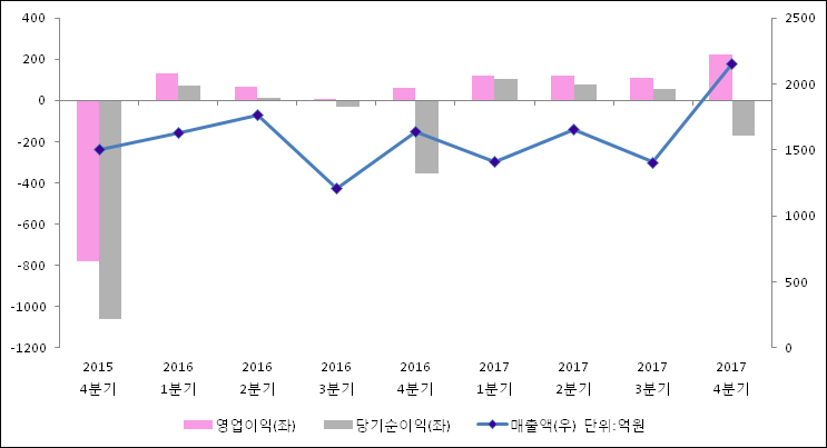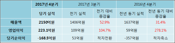 01월 18일 고려개발(004200)의 2017년 4분기 개별 잠정_대량변동 실적이 발표됐다. 작년 동기 대비해서 매출액은 31.4% 상승하여 2150억원을 기록했다. 영업이익은 278.1% 상승하여 223.1억원을 기록했다. 당기순이익은 -357억원에서-168.5억원으로 적자축소되었다고 발표했다.