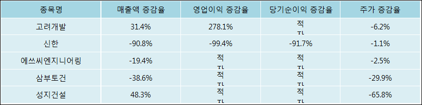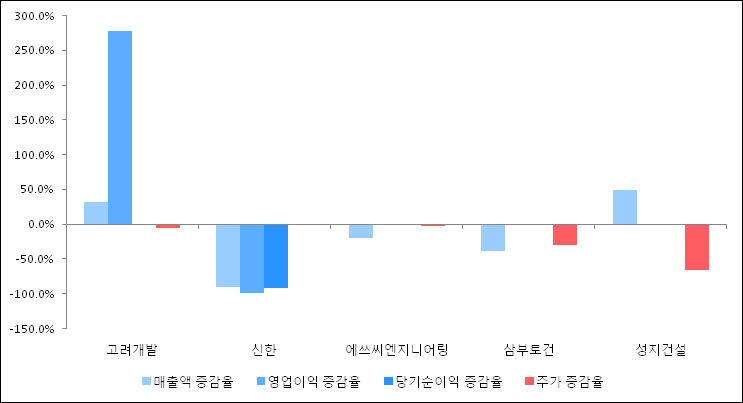 다음은 고려개발과 동일 업종 내 비교 그룹 종목의 각각 최근 실적의 전년 동기 대비 성장률이다. 고려개발의 매출액 증감율은 타 종목 대비 우수한 편이다. 그리고 주가는 하락하였지만 하락율이 비교적 크지는 않았다.