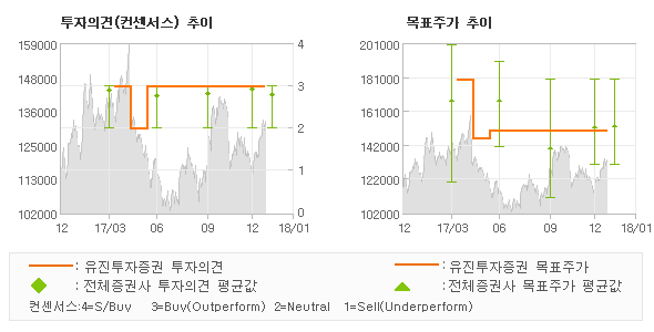 오늘 유진투자증권에서 발표된 '매수(유지)'의견 및 목표주가 150,000원은 전체의견에 수렴하면서 시장의 평균적인 기대감이 비교적 객관적으로 표현된 것으로 풀이되며 목표가평균과 대비해서 미미한 차이가 나는 것으로 집계되었다. 참고로 최근에 목표주가를 가장 공격적으로 제시한 삼성증권에서 투자의견 '매수'에 목표주가 180,000원을 제일 보수적인 의견을 제시한 하나금융투자에서 투자의견 'NEUTRAL(하향)'에 목표주가 130,000원을 제시한 바 있다.