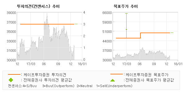 오늘 케이프투자증권에서 발표된 '매수(유지)'의견 및 목표주가 50,000원은 전체 컨센서스 대비해서 대체적으로 평균치에 해당하는 수준으로, 이번 의견은 동종목에 대한 전체적인 흐름에서 크게 벗어나지 않은 것으로 파악되며 목표가평균과 대비해서 미미한 차이가 나는 것으로 집계되었다. 참고로 최근에 목표주가를 가장 공격적으로 제시한 하나금융투자에서 투자의견 '매수'에 목표주가 50,000원을 제일 보수적인 의견을 제시한 하나금융투자에서 투자의견 '매수'에 목표주가 50,000원을 제시한 바 있다.