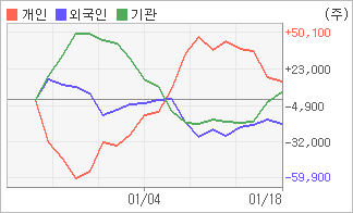 | 기관/개인 순매수, 외국인은 순매도(한달누적) 1월16일부터 전일까지 기관이 3거래일 연속 순매수했다. 4주간을 기준으로 보면 기관이 초반에 동종목을 순매수한 이후에 최근에는 순매수량이 줄어들고 있음에도 불구하고 5,203주를 순매수했고, 개인들도 매수반전의 모습을 보이며 13,250주를 순매수했다. 반면 그 동안 외국인은 매도 우위를 지속하면서 18,453주를 순매도했다. |