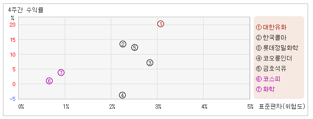 | 관련종목들 가운데 변동폭 작아도 수익율은 높아 22일 오전 9시20분 현재 전일대비 4.44% 오른 317,500원을 기록하고 있는 대한유화는 지난 1개월간 20.49% 상승했다. 같은 기간동안 변동성의 크기를 말해주는 표준편차는 3%를 기록했다. 이는 코스피 업종내에서 주요종목들과 비교해볼 때 대한유화의 월간 주가수익률이 가장 높았던 만큼 변동성도 가장 높은 수준을 유지했다는 뜻이다. 최근 1개월을 기준으로 대한유화의 위험을 고려한 수익률은 6.8을 기록했는데, 변동성이 가장 컸으나 주가상승률도 매우 높았기때문에 위험대비 수익률도 높은 수준을 나타냈다. 뿐만아니라 코스피업종의 위험대비수익률인 1.8보다도 높기 때문에 업종대비 성과도 좋았다고 할 수 있다. 다음으로 업종과 시장을 비교해보면 대한유화가 속해 있는 코스피업종은 화학지수보다 변동성과 수익률이 모두 낮은 모습을 보여주고 있다. 다시 말해서 동업종의 탄력이 떨어지면서 업종상승률도 미진했다는 의미이다. |