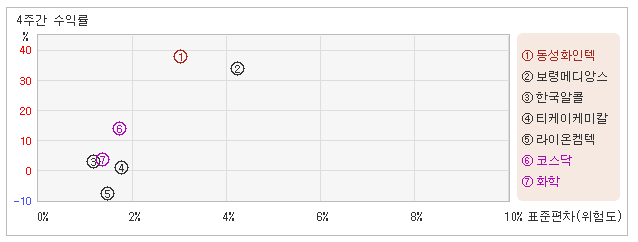 | 관련종목들 가운데 변동폭 작아도 수익율은 높아 22일 오전 11시25분 현재 전일대비 5.79% 오른 6,760원을 기록하고 있는 동성화인텍은 지난 1개월간 38.24% 상승했다. 같은 기간동안 변동성의 크기를 말해주는 표준편차는 3%를 기록했다. 이는 화학 업종내에서 주요종목들과 비교해볼 때 동성화인텍의 월간 주가수익률이 가장 높았던 만큼 변동성도 상당히 높은 수준을 유지했다는 뜻이다. 최근 1개월을 기준으로 동성화인텍의 위험을 고려한 수익률은 12.7을 기록했는데, 변동성은 높았으나 주가수익률이 양호했기 때문에 위험대비 수익률도 높은 수준을 나타냈다. 뿐만아니라 화학업종의 위험대비수익률인 3.0보다도 높기 때문에 업종대비 성과도 좋았다고 할 수 있다. 다음으로 업종과 시장을 비교해보면 동성화인텍이 속해 있는 화학업종은 코스닥지수보다 변동성과 수익률이 모두 낮은 모습을 보여주고 있다. 다시 말해서 동업종의 탄력이 떨어지면서 업종상승률도 미진했다는 의미이다. |