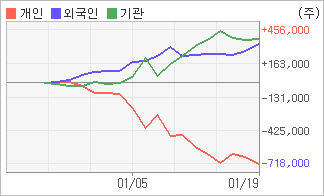 | 외국인/기관 순매수, 개인은 순매도(한달누적) 1월18일부터 전일까지 외국인이 2거래일 연속 순매수를 보였다. 4주간을 기준으로 보면 외국인이 초반에 동종목을 순매수한 이후에 기세를 이어가며 340,236주를 순매수했고, 기관도 방향성있는 매매를 하면서 377,282주를 순매수했다. 반면 개인들은 매도쪽으로 방향을 잡으면서 717,518주를 순매도한 것으로 나타났다. |