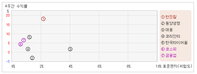 | 관련종목들 가운데서 변동폭은 낮지만 수익률은 커 24일 오후 2시25분 현재 전일대비 5.15% 오른 21,450원을 기록하고 있는 한진칼은 지난 1개월간 18.18% 상승했다. 동기간 동안에 주가움직임의 위험지표인 표준편차는 2.1%를 기록했다. 이는 금융업 업종내에서 주요종목들과 비교해볼 때 한진칼의 월간 주가수익률이 가장 높았던 만큼 변동성도 상당히 높은 수준을 유지했다는 뜻이다. 최근 1개월을 기준으로 한진칼의 위험을 고려한 수익률은 8.6을 기록했는데, 변동성은 높았으나 주가수익률이 양호했기 때문에 위험대비 수익률도 높은 수준을 나타냈다. 뿐만아니라 금융업업종의 위험대비수익률인 8.1보다도 높기 때문에 업종대비 성과도 좋았다고 할 수 있다. 다음으로 업종과 시장을 비교해보면 한진칼이 속해 있는 금융업업종은 코스피지수보다 변동성과 수익률이 모두 높은 모습이다. 다시 말하면 동업종에 탄력이 붙으면서 지수대비 초과상승했다는 의미이다. |