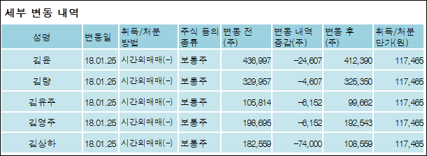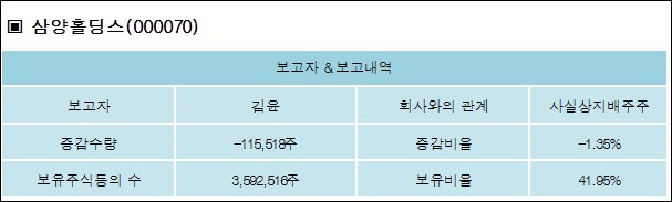 삼양홀딩스(000070)는 25일 사실상지배주주 김윤을 비롯한 특별관계자의 보유주식이 감소되었다고 발표했다. 이는 직전 보고일보다 115,518주 감소하여 지분율은 41.95%로 하락했다. 이번 보고 사유는 단순처분으로 알려졌다.
