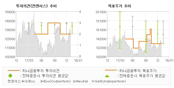 오늘 하나금융투자에서 발표된 'NEUTRAL'의견 및 목표주가 130,000원은 전체 컨센서스 대비해서 비교적 낮은 수준으로 동종목에 대한 기대감을 다소 약하게 표현한 것으로 풀이되며 목표가평균 대비 13.3%정도 미달하고 있는 것으로 집계되었다. 참고로 최근에 목표주가를 가장 공격적으로 제시한 삼성증권에서 투자의견 '매수'에 목표주가 180,000원을 제일 보수적인 의견을 제시한 NH투자증권에서 투자의견 'HOLD(유지)'에 목표주가 130,000원을 제시한 바 있다.