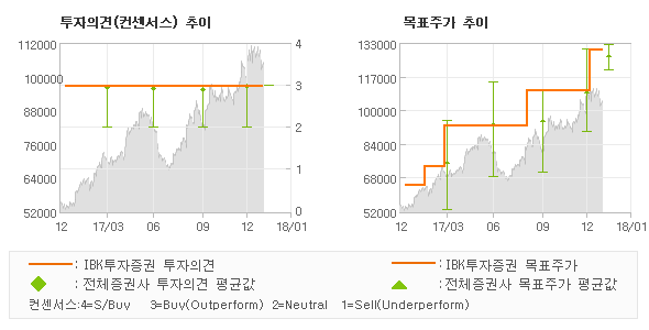 오늘 IBK투자증권에서 발표된 '매수(유지)'의견 및 목표주가 130,000원은 전체 컨센서스 대비해서 대체적으로 평균치에 해당하는 수준으로, 이번 의견은 동종목에 대한 전체적인 흐름에서 크게 벗어나지 않은 것으로 파악되며 목표가평균 대비 5.1% 초과하고 있는 것으로 집계되었다. 참고로 최근에 목표주가를 가장 공격적으로 제시한 하이투자증권에서 투자의견 '매수(유지)'에 목표주가 132,000원을 제일 보수적인 의견을 제시한 BNK투자증권에서 투자의견 '매수(유지)'에 목표주가 107,000원을 제시한 바 있다.