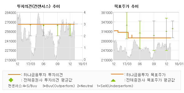 하나금융투자의 동종목에 대한 최근 1년동안의 투자의견은 전체적으로 큰 변화없이 유지되고 있다. 목표주가는 2017년1월 315,000원까지 높아졌다가 2017년4월 290,000원을 최저점으로 목표가가 제시된 이후 최근에도 290,000원으로 제시되고 있다.