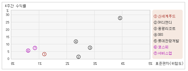 | 신세계푸드 | 용평리조트 | 롯데관광개발 | SK디앤디 | SBS | |