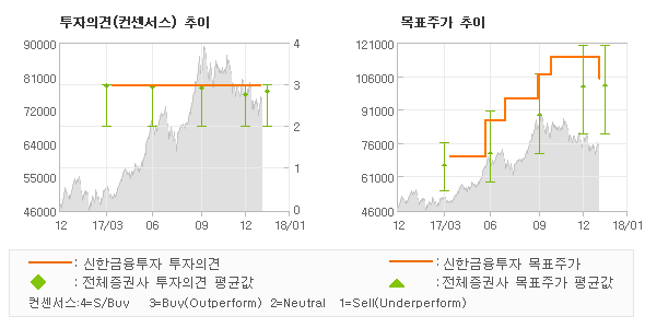 신한금융투자의 동종목에 대한 최근 6개월 동안의 투자의견은 전체적으로 큰 변화없이 유지되고 있다. 목표주가는 2017년4월 70,000원이 저점으로 제시된 이후 2017년10월 115,000원을 최고점으로 목표가가 제시되었고 최근에는 105,000원으로 다소 하향조정되고 있다.