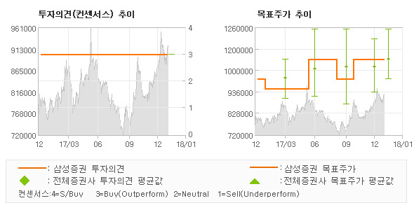 삼성증권의 동종목에 대한 최근 1년동안의 투자의견은 전체적으로 큰 변화없이 유지되고 있다. 목표주가는 2017년1월 950,000원이 저점으로 제시된 이후에 최근에는 1,100,000원까지 상향조정되고 있다.