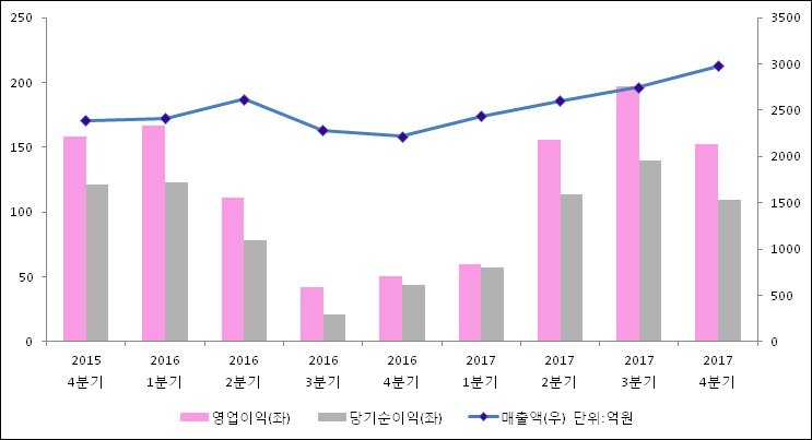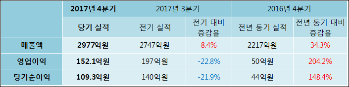 01월 26일 국도화학(007690)의 2017년 4분기 연결 잠정_대량변동 실적이 발표됐다. 매출액, 영업이익, 당기순이익 모두 지난해 같은 기간 대비 상승하였다. 매출액은 34.3%, 상승한 2977억원으로 발표되었다. 영업이익과 당기순이익은 각각 204.2%, 148.4% 증가하여 152.1억원, 109.3억원으로 기록 되었다.