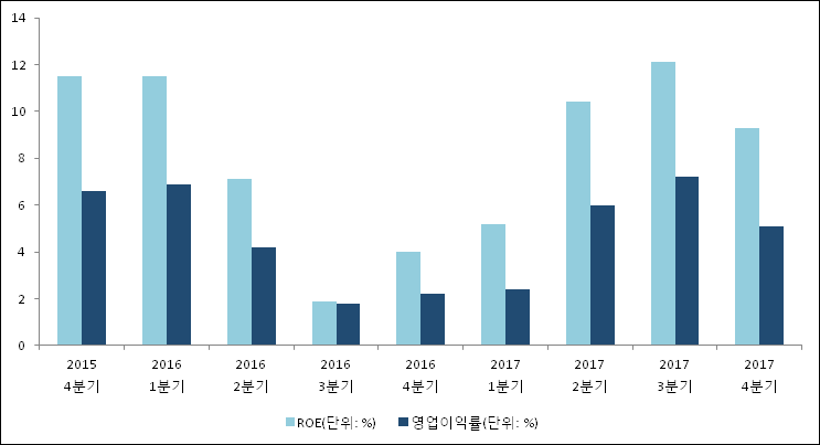이번분기 기준으로 추정되는 국도화학의 자기자본이익률(ROE)은 11.5%로 나타났다. 전년 동기인 2016년 4분기 ROE는 5.2%로 이번 분기에 6.3%p 상승했다. 한편 동종목의영업이익률은 6.6%이다. 지난해 동기 영업이익률은 2.4%로 이번 4분기가 4.2%p 상승했다.