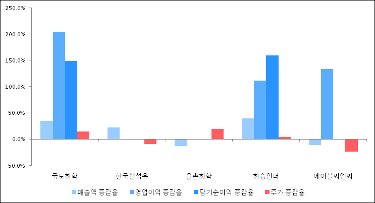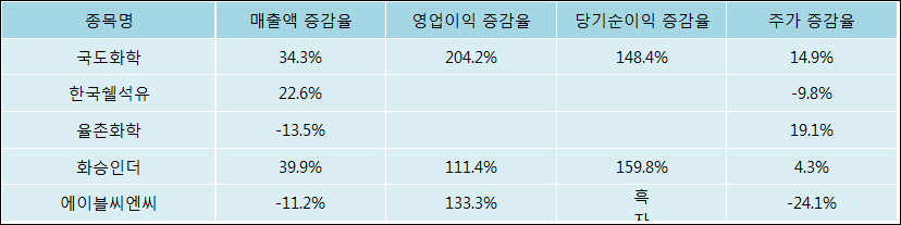 다음은 국도화학과 동일 업종 내 비교 그룹 종목의 각각 최근 실적의 전년 동기 대비 성장률이다. 국도화학의 매출액 증감율은 타 종목 대비 우수한 편이다. 그리고 주가 상승률은 높은 편이다.