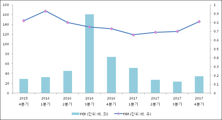 주가가 1주당 수익의 몇배가 되는지 나타내는 주가수익비율(PER)은 28.7배로 나타났다. 전년 동기 PER은 51.3배로 이번 분기에 하락했다.주가가 1주당 순자산의 몇배인지 알려주는 주가순자산비율인 PBR은 0.82배이다. PBR은 최근 4분기 이상 꾸준히 상승하고 있다. 지난해 동기 PBR은 0.66배로 이번 4분기 PBR이 상승했다.