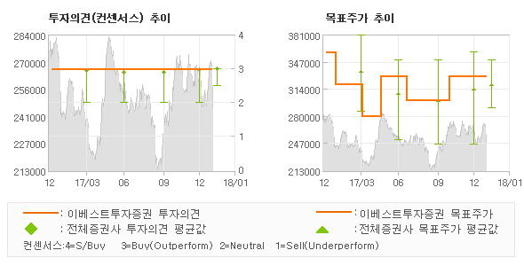| 오늘 이베스트투자증권에서 발표된 'BUY(MAINTAIN)'의견 및 목표주가 330,000원은 전체 컨센서스 대비해서 대체적으로 평균치에 해당하는 수준으로, 이번 의견은 동종목에 대한 전체적인 흐름에서 크게 벗어나지 않은 것으로 파악되며 목표가평균 대비 5.3% 초과하고 있는 것으로 집계되었다. 참고로 최근에 목표주가를 가장 공격적으로 제시한 DB금융투자에서 투자의견 'BUY(유지)'에 목표주가 350,000원을 제일 보수적인 의견을 제시한 한화투자증권에서 투자의견 'HOLD(유지)'에 목표주가 270,000원을 제시한 바 있다. |