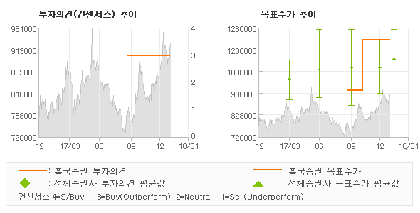 | 오늘 흥국증권에서 발표된 'BUY'의견 및 목표주가 1,200,000원은 전체 컨센서스 대비해서 대체적으로 평균치에 해당하는 수준으로, 이번 의견은 동종목에 대한 전체적인 흐름에서 크게 벗어나지 않은 것으로 파악되며 목표가평균 대비 8.8% 초과하고 있는 것으로 집계되었다. 참고로 최근에 목표주가를 가장 공격적으로 제시한 하이투자증권에서 투자의견 'BUY(유지)'에 목표주가 1,250,000원을 제일 보수적인 의견을 제시한 현대차투자증권에서 투자의견 '매수'에 목표주가 1,000,000원을 제시한 바 있다. |