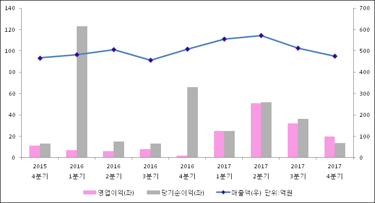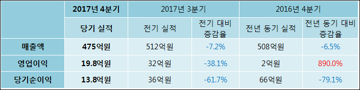 01월 29일 모토닉(009680)의 2017년 4분기 연결 잠정_대량변동 실적이 발표됐다. 영업이익은 지난해 같은 기간 대비해서 890% 증대되어 19.8억원으로 발표됐다. 이와는 상반되게 매출액과 당기순이익은 각각 6.5%, 79.1% 감소하여 475억원, 13.8억원으로 기록 되었다.