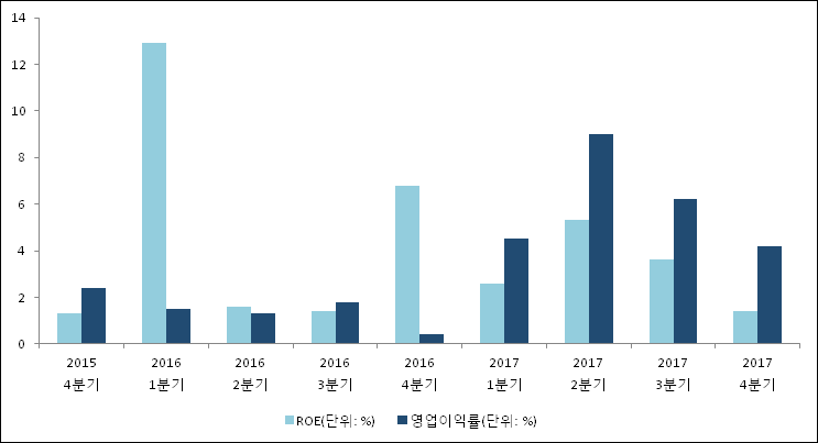 이번분기 기준으로 추정되는 모토닉의 자기자본이익률(ROE)은 1.3%로 나타났다. ROE는 최근 3분기 이상 연속으로 하락했다. 전년 동기인 2016년 4분기 ROE는 2.6%로 이번 분기에 1.3%p 하락했다. 한편 동종목의영업이익률은 2.4%이다. 최근 3분기 이상 연속으로 하락하는 추세이다. 지난해 동기 영업이익률은 4.5%로 이번 4분기에 2.1%p 하락했다.