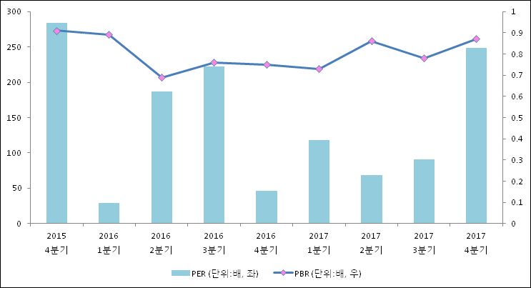 주가가 1주당 수익의 몇배가 되는지 나타내는 주가수익비율(PER)은 284.2배로 나타났다. PER은 최근 3분기 이상 꾸준히 상승하고 있다. 전년 동기 PER은 117.89배로 이번 분기에 상승했다.주가가 1주당 순자산의 몇배인지 알려주는 주가순자산비율인 PBR은 0.91배이다. 지난해 동기 PBR은 0.73배로 이번 4분기 PBR이 상승했다.