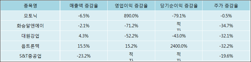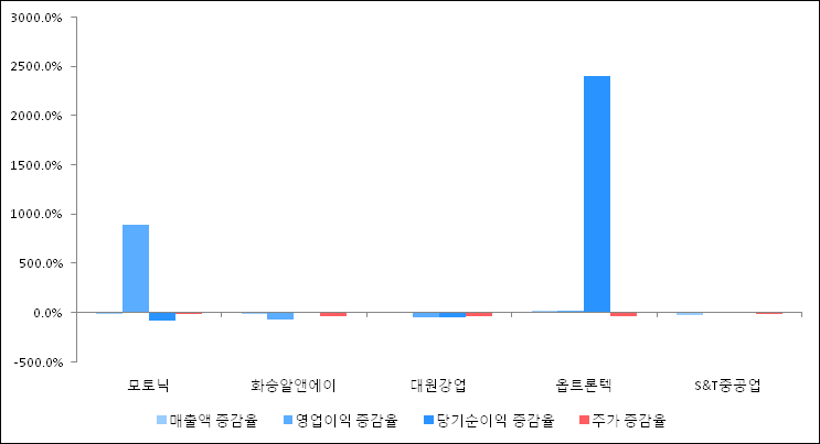 다음은 모토닉과 동일 업종 내 비교 그룹 종목의 각각 최근 실적의 전년 동기 대비 성장률이다. 모토닉의 매출액 증감율은 타 종목 대비 저조한 편이다. 그리고 주가는 하락하였지만 가장 나은 상승률을 기록하였다.