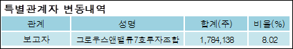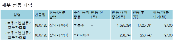 동원(003580)은 24일 주주 그로우스앤밸류7호투자조합의 보유주식이 증가되었다고 발표했다. 이는 직전 보고일보다 1,784,138주 증가하여 지분율은 8.02%로 상승했다. 이번 보고 사유는 주식양수도계약에 따른 주식및전환사채매입으로 알려졌다.