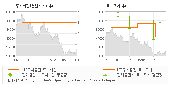 KTB투자증권의 동종목에 대한 최근 1년동안의 투자의견은 전체적으로 큰 변화없이 유지되고 있다. 목표주가는 2018년2월 56,000원까지 높아졌다가 2018년7월 45,000원을 최저점으로 목표가가 제시된 이후 최근에도 45,000원으로 제시되고 있다.