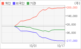 | 외국인과 기관은 순매도, 개인은 순매수(한달누적) 기관이 5일연속 순매수를 보이고 있는 반면에 외국인은 6일연속 순매도를 보이고 있다. 4주간을 기준으로 보면 외국인이 매도 우위를 지속하면서 216,324주를 순매도했고, 기관도 매도 관점으로 접근하면서 52,398주를 순매도했지만, 개인은 오히려 순매수량을 늘리며 268,722주를 순매수했다. |
