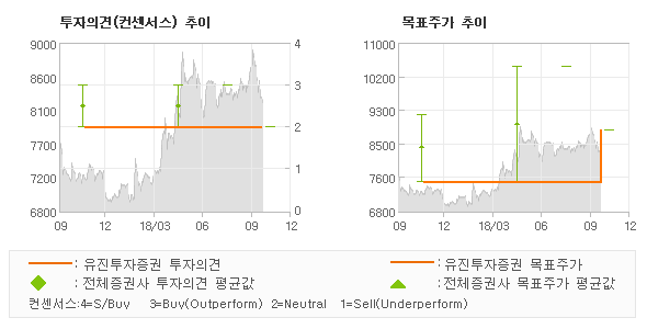 오늘 유진투자증권에서 발표된 'HOLD(유지)'의견 및 목표주가 8,800원은 전체의견을 소폭 하회하는 수준으로 약간이나마 보수적으로 표현된 것으로 풀이되며 목표가평균 대비 8.3%정도 미달하고 있는 것으로 집계되었다. 참고로 최근에 목표주가를 가장 공격적으로 제시한 케이프투자증권에서 투자의견 'BUY(유지)'에 목표주가 10,400원을 제시한 바 있다.
