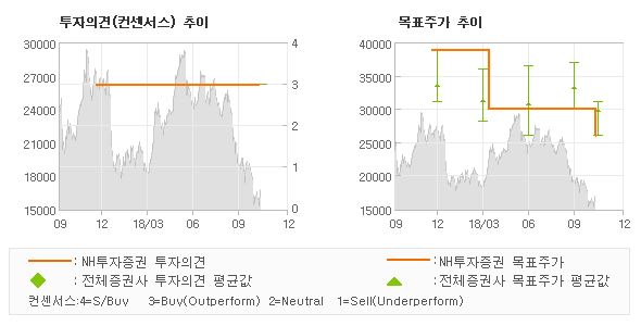 NH투자증권의 동종목에 대한 최근 1년동안의 투자의견은 전체적으로 큰 변화없이 유지되고 있다. 목표주가는 2017년12월 39,000원까지 높아졌다가 2018년4월 30,000원을 최저점으로 목표가가 제시된 이후 최근에 26,000원으로 새롭게 조정되고 있다.