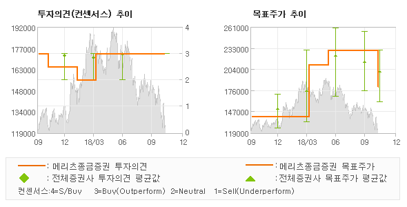 메리츠종금증권의 동종목에 대한 최근 1년동안의 투자의견은 전체적으로 큰 변화없이 유지되고 있다. 목표주가는 2017년10월 140,000원이 저점으로 제시된 이후 2018년6월 230,000원을 최고점으로 목표가가 제시되었고 최근에는 180,000원으로 다소 하향조정되고 있다.