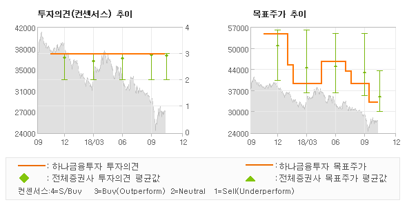 하나금융투자의 동종목에 대한 최근 1년동안의 투자의견은 전체적으로 큰 변화없이 유지되고 있다. 목표주가는 2017년11월 55,000원까지 높아졌다가 2018년10월 33,000원을 최저점으로 목표가가 제시된 이후 최근에도 33,000원으로 제시되고 있다.