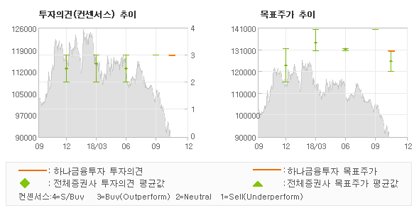 오늘 하나금융투자에서 발표된 'BUY(신규)'의견 및 목표주가 130,000원은 전체의견에 수렴하면서 시장의 평균적인 기대감이 비교적 객관적으로 표현된 것으로 풀이되며 목표가평균 대비 4% 초과하고 있는 것으로 집계되었다. 참고로 최근 증권사 매매의견 중에서 제일 보수적인 의견을 제시한 KB증권에서 투자의견 'BUY(유지)'에 목표주가 120,000원을 제시한 바 있다.