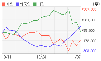 | 외국인/기관 순매수, 개인은 순매도(한달누적) 11월1일부터 전일까지 외국인이 5거래일 연속 동종목을 사들였다. 4주간을 기준으로 보면 외국인이 매매관점을 매도에서 매수로 전환하면서 137,929주를 순매수했고, 기관도 초반에 동종목을 순매수한 이후에 최근에는 순매수량이 줄어들고 있음에도 불구하고 22,694주를 순매수했다. 반면 개인들은 매도쪽으로 방향을 잡으면서 160,623주를 순매도한 것으로 나타났다. |