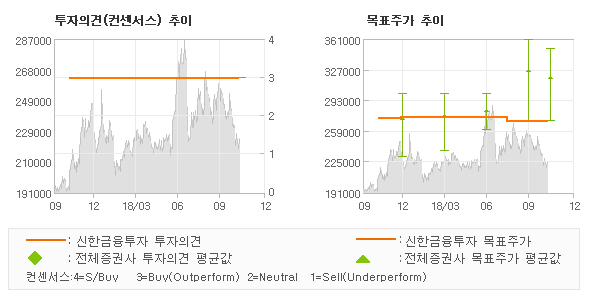 신한금융투자의 동종목에 대한 최근 1년동안의 투자의견은 전체적으로 큰 변화없이 유지되고 있다. 목표주가는 2017년12월 274,000원까지 높아졌다가 2018년8월 270,000원을 최저점으로 목표가가 제시된 이후 최근에도 270,000원으로 제시되고 있다.