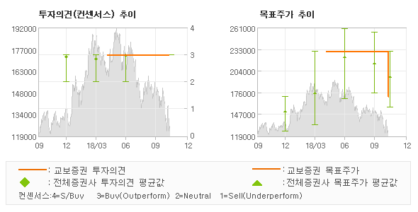 오늘 교보증권에서 발표된 'BUY'의견 및 목표주가 170,000원은 전체의견에 수렴하면서 시장의 평균적인 기대감이 비교적 객관적으로 표현된 것으로 풀이되며 목표가평균 대비 8.5%정도 미달하고 있는 것으로 집계되었다. 참고로 최근에 목표주가를 가장 공격적으로 제시한 BNK투자증권에서 투자의견 '매수'에 목표주가 230,000원을 제일 보수적인 의견을 제시한 신한금융투자에서 투자의견 '매수(유지)'에 목표주가 156,000원을 제시한 바 있다.
