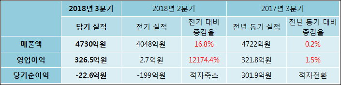 11월 08일 CJCGV(079160)의 2018년 3분기 연결 잠정 실적이 발표됐다. 매출액은 전년 같은 기간 대비해서 0.17% 증가하여 4730억원을 달성했다. 영업이익은 1.45% 증가하여 326.5억원을 달성했다. 당기순이익은 -22.6억원으로 301.9억원에서 적자전환되었다.
