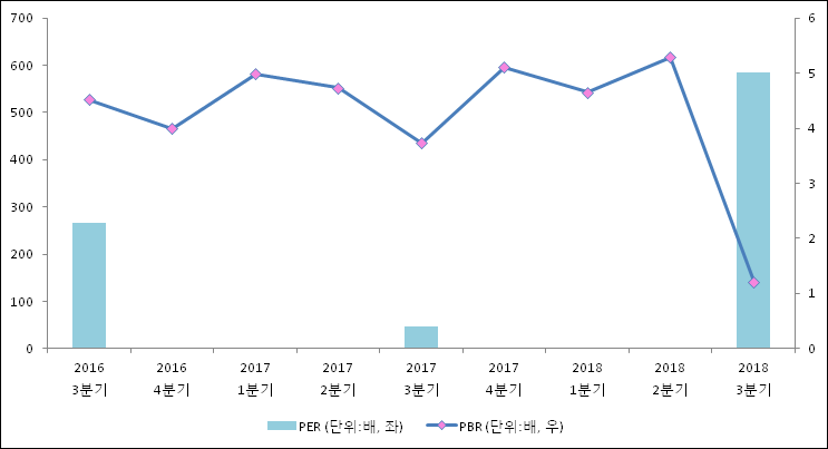 주가가 1주당 수익의 몇배가 되는지 나타내는 주가수익비율(PER)은 584.1배로 나타났다. 전년 동기 PER은 46.9배로 이번 분기에 상승했다.주가가 1주당 순자산의 몇배인지 알려주는 주가순자산비율인 PBR은 1.21배이다.최근 1년 대비 이번 분기 PBR은 급락했다. 지난해 동기 PBR은 3.73배로 이번 3분기 PBR이 하락했다.