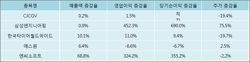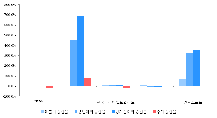 다음은 CJCGV와 동일 업종 내 비교 그룹 종목의 각각 최근 실적의 전년 동기 대비 성장률이다. CJCGV의 매출액은 증가했지만 증감율은 타 종목 대비 가장 저조한 편이다. 그리고 주가의 하락율이 비교적 큰 편으로 나타났다.