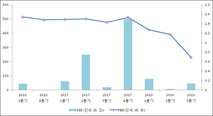 주가가 1주당 수익의 몇배가 되는지 나타내는 주가수익비율(PER)은 46.4배로 나타났다. 전년 동기 PER은 20.04배로 이번 분기에 상승했다.주가가 1주당 순자산의 몇배인지 알려주는 주가순자산비율인 PBR은 0.69배이다. PBR은 최근 3분기 이상 연속으로 하락하고 있다. 지난해 동기 PBR은 1.43배로 이번 3분기 PBR이 하락했다.
