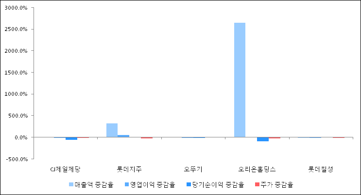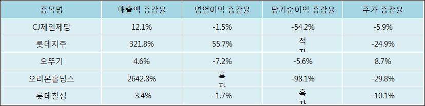 다음은 CJ제일제당과 동일 업종 내 비교 그룹 종목의 각각 최근 실적의 전년 동기 대비 성장률이다. CJ제일제당의 매출액 증감율은 타 종목 대비 양호한 편이다. 그리고 주가는 하락하였지만 비교적 적은 하락율을 보였다.