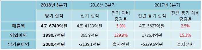11월 08일 롯데쇼핑(023530)의 2018년 3분기 연결 잠정 실적이 발표됐다. 전년 동기 대비해서 매출액은 2.5% 상승하여 4조 6749억원을 기록했다. 영업이익은 15.3% 증가하여 1990.7억원을 달성했다. 당기순이익은 -5329.6억원에서2080.4억원으로 흑자전환되었다.