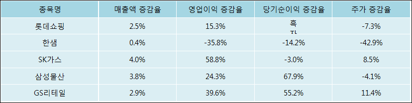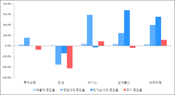 다음은 롯데쇼핑과 동일 업종 내 비교 그룹 종목의 각각 최근 실적의 전년 동기 대비 성장률이다. 롯데쇼핑의 매출액은 증가했지만 증감율은 타 종목 대비 저조한 편이다. 그리고 주가의 하락율이 비교적 큰 편으로 나타났다.