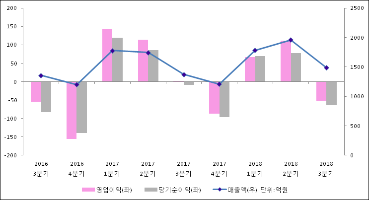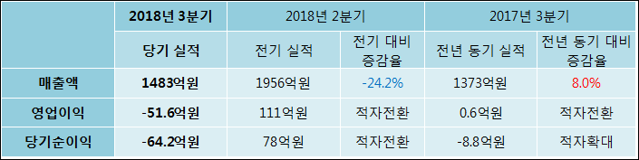 11월 14일 대동공업(000490)의 2018년 3분기 연결 확정 실적이 발표됐다. 전년 동기 대비해서 매출액은 8.04% 상승하여 1483억원을 기록했다. 영업이익은 0.6억원에서 -51.6억원으로 적자전환되었다. 당기순이익은 -8.8억원에서-64.2억원으로 적자확대되었다고 발표했다.