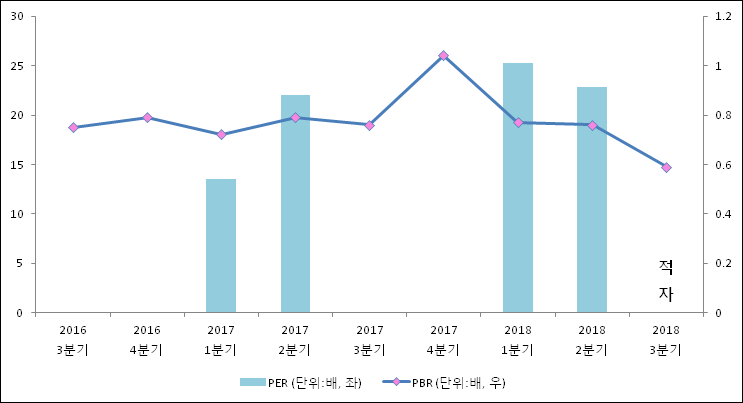 주가가 1주당 순자산의 몇배인지 알려주는 주가순자산비율인 PBR은 0.59배이다. PBR은 최근 3분기 이상 연속으로 하락하고 있다. 지난해 동기 PBR은 0.76배로 이번 3분기 PBR이 하락했다.
